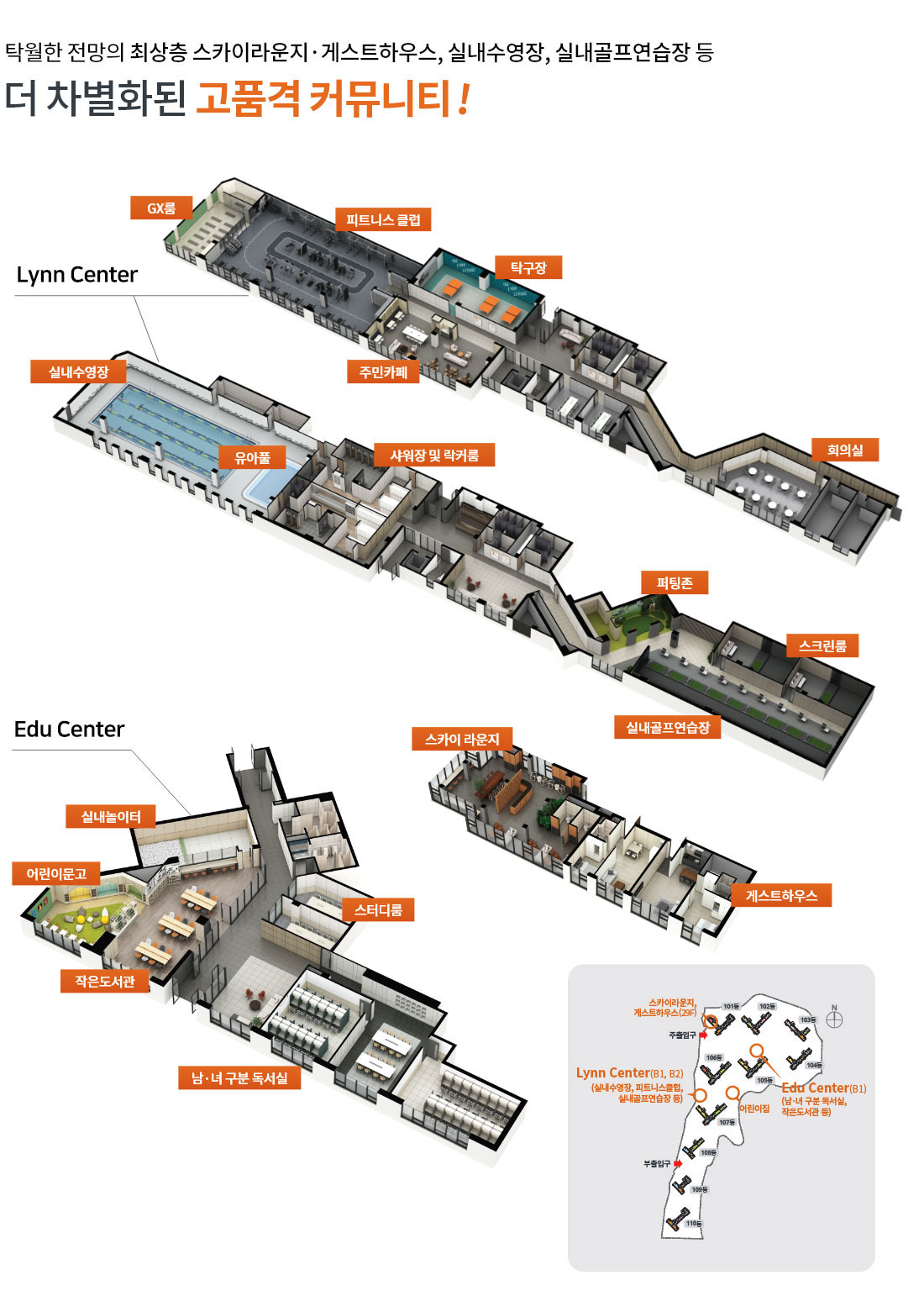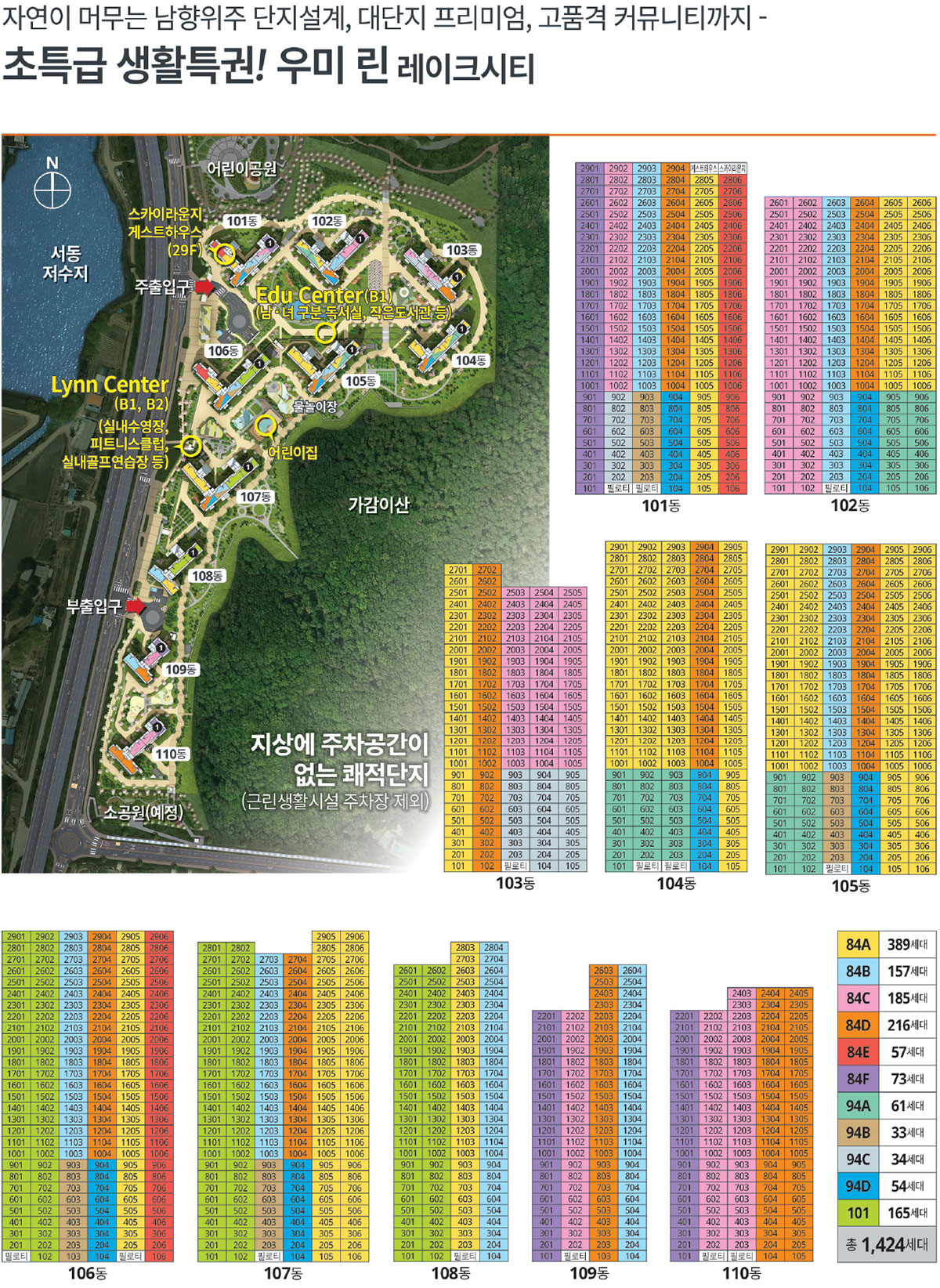 조망을 고려한 배치, 공간의 여유를 담은 중대형 타입 대단지 서동저수지, 가감이산 등 조망을 고려한 남향위주 단지배치 중대형 타입 전용 84·94·101㎡로 구성된 총 1,424세대 대단지 우수한 조망권 및 지상에 주차공간이 없는 쾌적하고 안전한 단지 (세대당 1.5대의 넉넉한 주차공간/근린생활시설 제외)